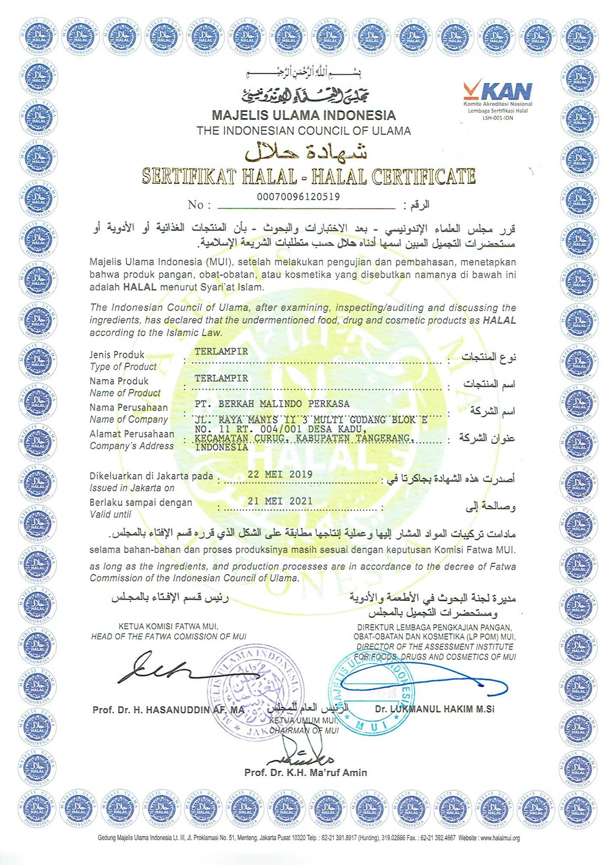 We are committed to always give guarantee and standard of food safety to consumers. All of our products have been completed with HALAL certificate from MajelisUlama Indonesia (MUI).